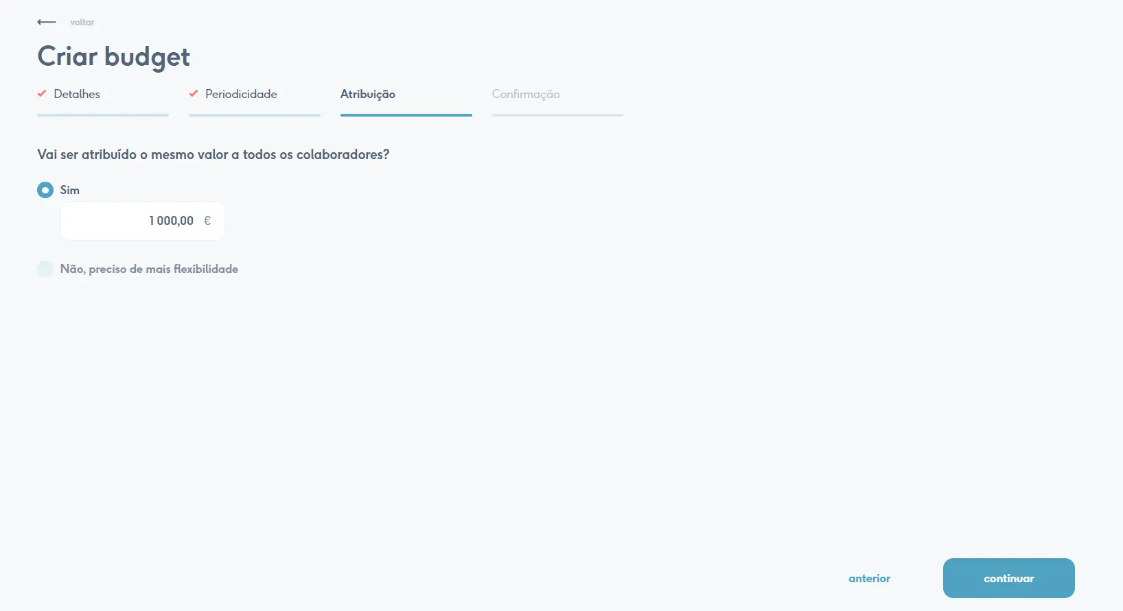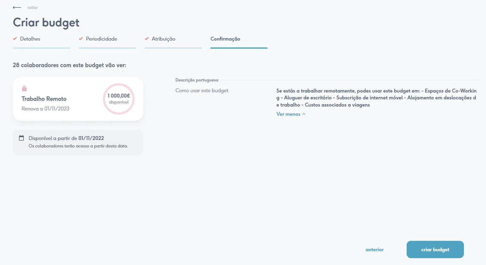 Por fim, basta clicar em “confirmar” e… já está! No dia em que começa, o budget fica visível para os colaboradores e estes podem começar a submeter os seus reembolsos imediatamente.