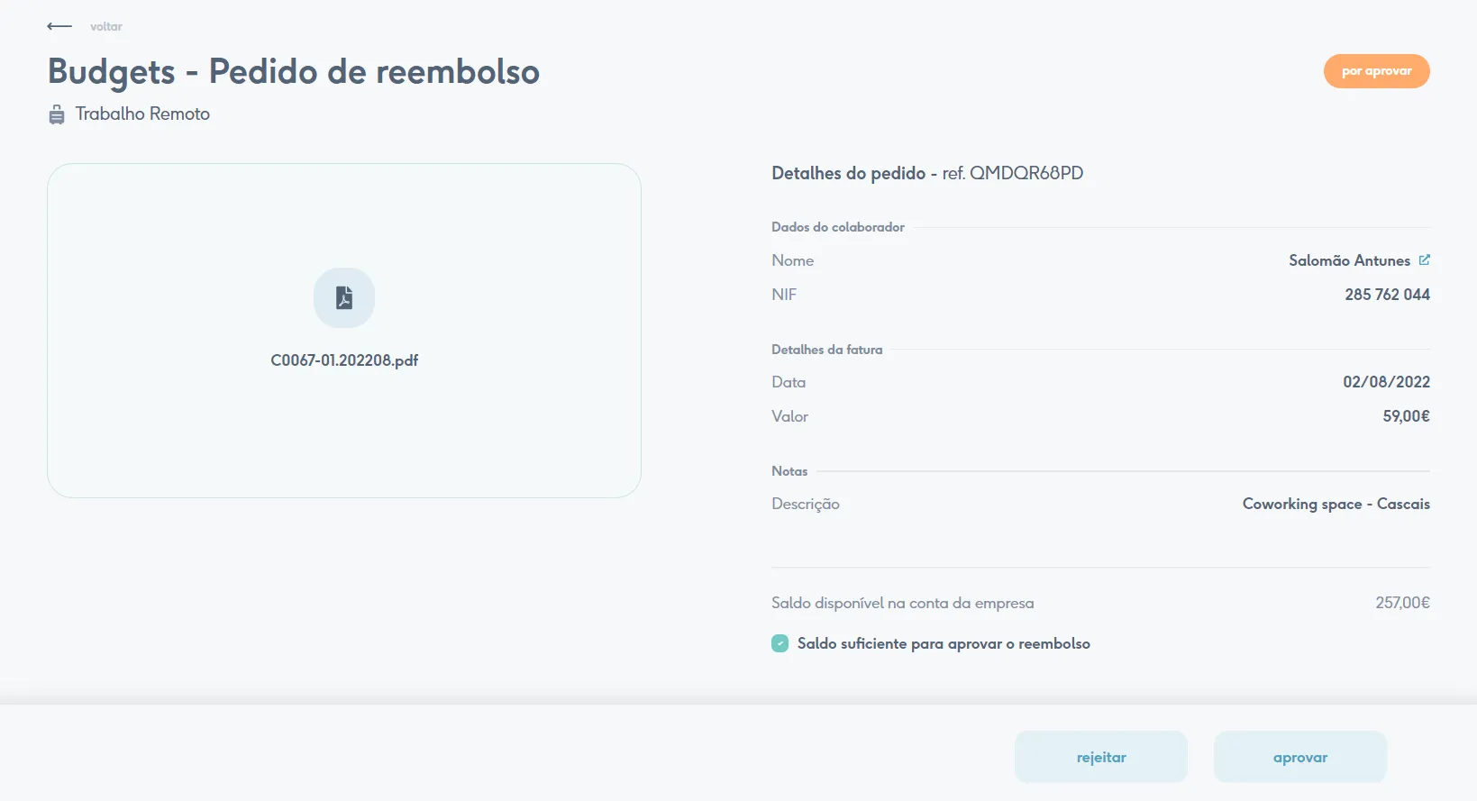 O processo de pedido de reembolso é em tudo semelhante ao dos benefícios. No entanto, tem uma pequena diferença: no que toca aos budgets, todos os saldos atribuídos são meramente indicativos, e todos os reembolsos são feitos através da conta da empresa na Coverflex - a empresa só tem de garantir que tem fundos suficientes na sua conta antes de aprovar o reembolso.