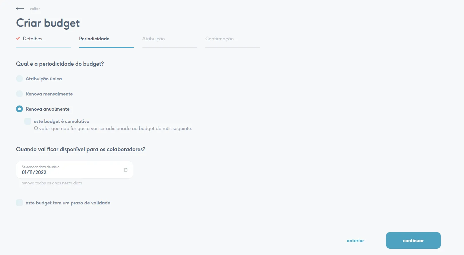 Posto isto, o segundo passo é definir com que frequência o budget vai ser atribuído (pontual, mensal ou anualmente), quando começa e quando/se acaba. É ainda possível definir se os saldos remanescentes transitam de uma atribuição para a seguinte - por exemplo, se transitarem, se a um colaborador sobrarem 15€ dos 25€ do budget de trabalho remoto de janeiro, o saldo no início de fevereiro será de 40€.